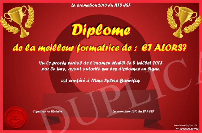Envoyez par email votre Diplôme de la meilleur formatrice de : ET ALORS? personalisé