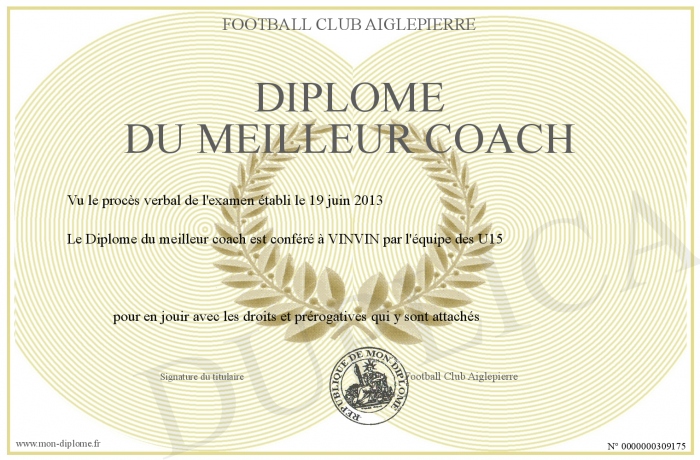 Envoyez par email votre Diplome du meilleur coach personalisé