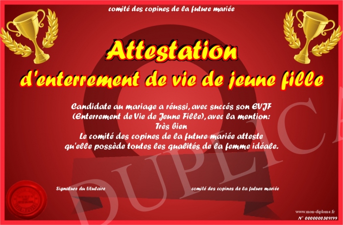 Envoyez par email votre Attestation d'enterrement de vie de jeune fille personalisé