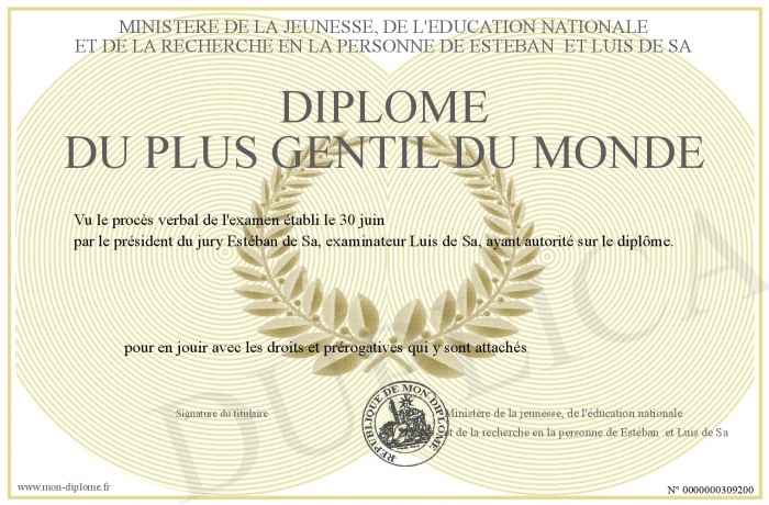 Envoyez par email votre Diplôme du plus gentil du monde personalisé