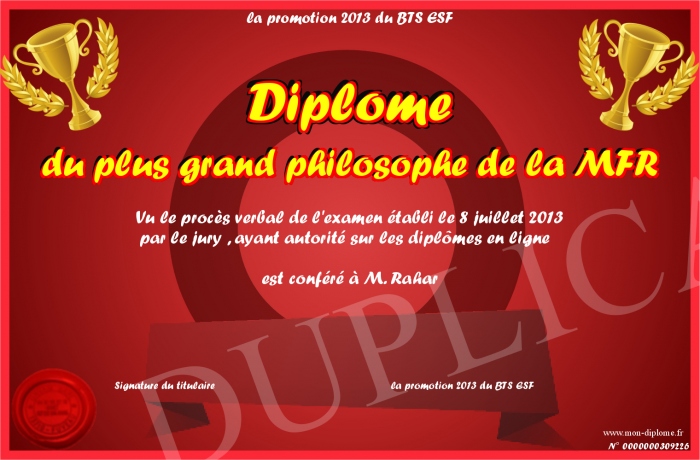 Envoyez par email votre Diplôme du plus grand philosophe de la MFR personalisé