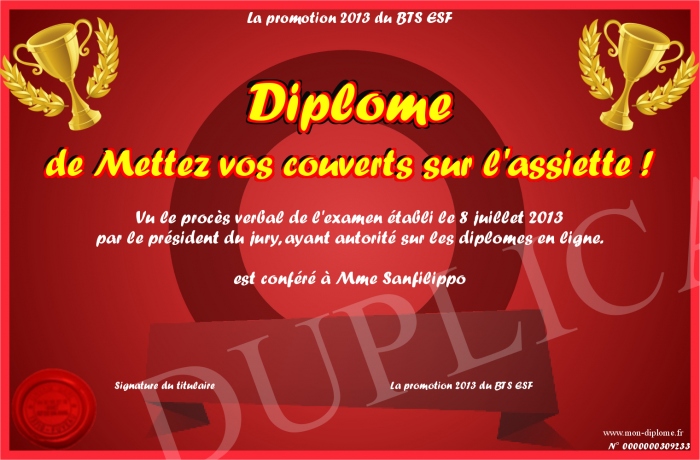 Envoyez par email votre Diplôme de Mettez vos couverts sur l'assiette ! personalisé