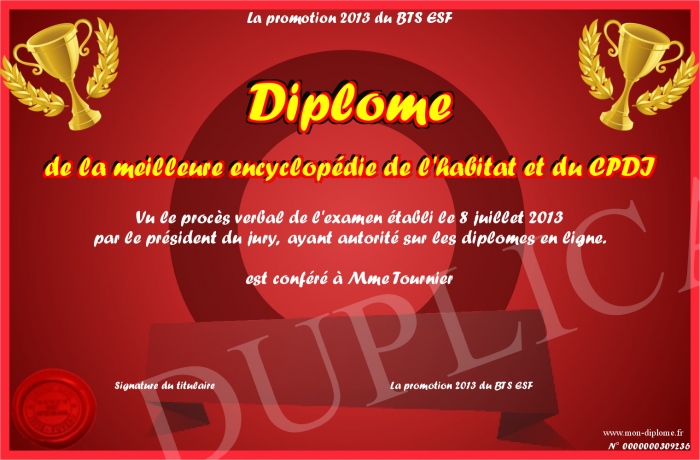 Envoyez par email votre Diplôme de la meilleure encyclopédie de l'habitat et du CPDI personalisé