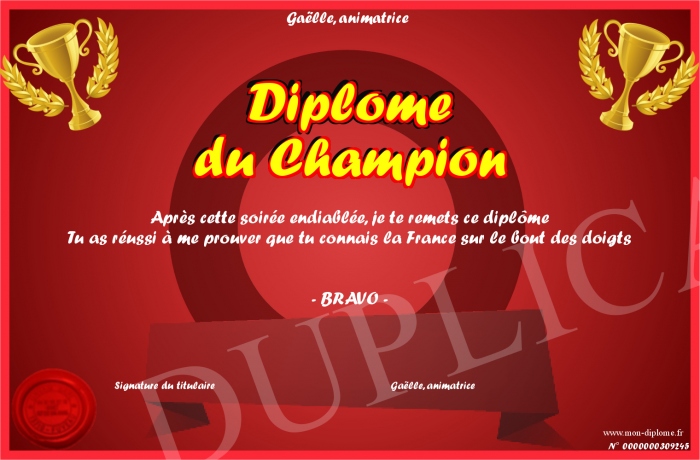 Envoyez par email votre Diplôme du Champion personalisé