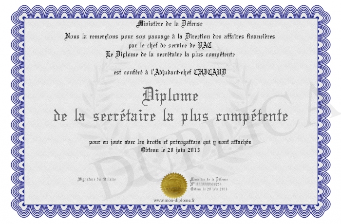 Envoyez par email votre Diplome de la secrétaire la plus compétente personalisé