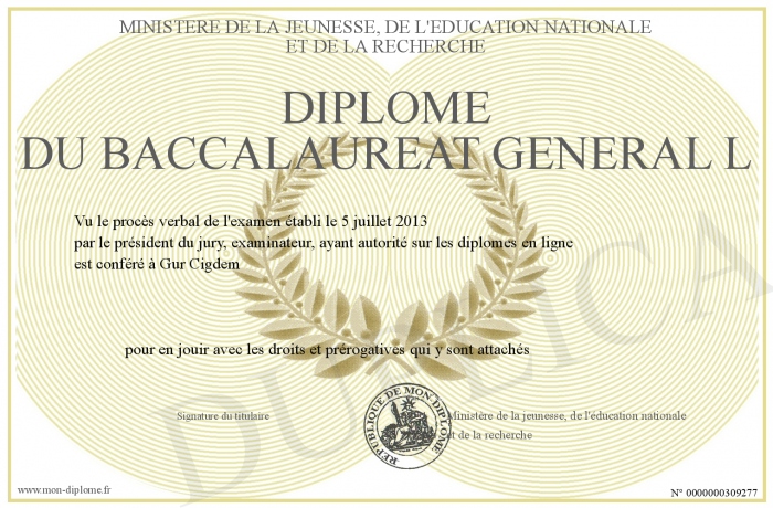 Envoyez par email votre Diplôme du baccalaureat général L personalisé