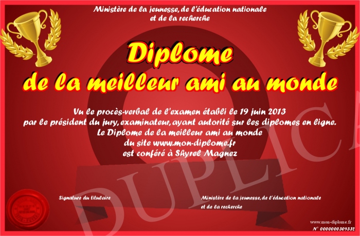 Envoyez par email votre Diplôme de la meilleur ami au monde personalisé