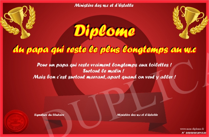 Envoyez par email votre Diplôme du papa qui reste le plus longtemps au w.c personalisé