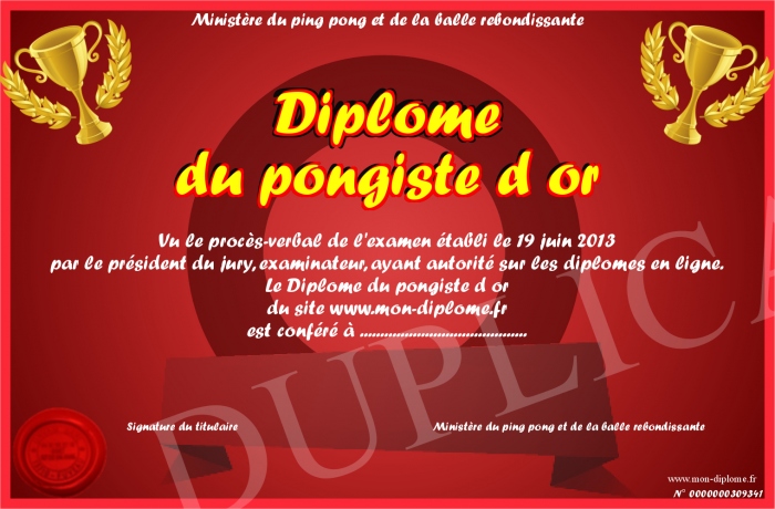 Envoyez par email votre Diplôme du pongiste d or personalisé