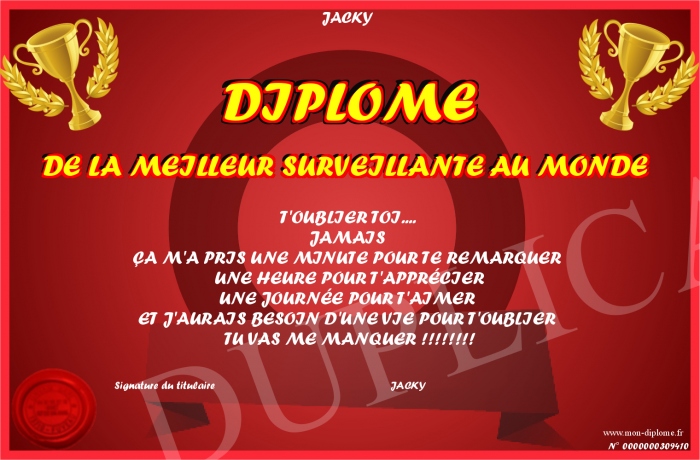Envoyez par email votre DIPLOME DE LA MEILLEUR SURVEILLANTE AU MONDE personalisé
