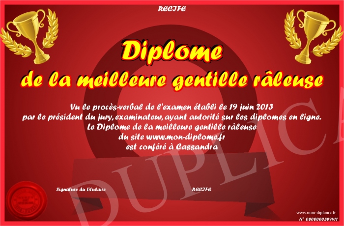 Envoyez par email votre Diplôme de la meilleure gentille râleuse personalisé