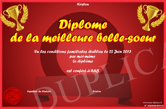 Envoyez par email votre Diplôme de la meilleure belle-soeur personalisé