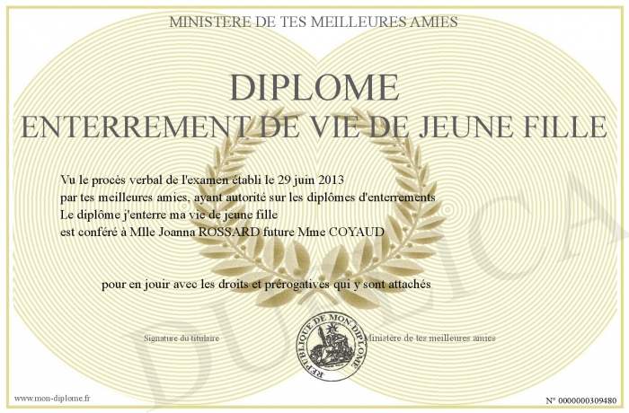 Envoyez par email votre Diplôme enterrement de vie de jeune fille personalisé