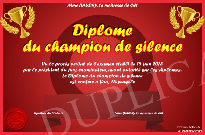 Envoyez par email votre Diplôme du champion de silence personalisé