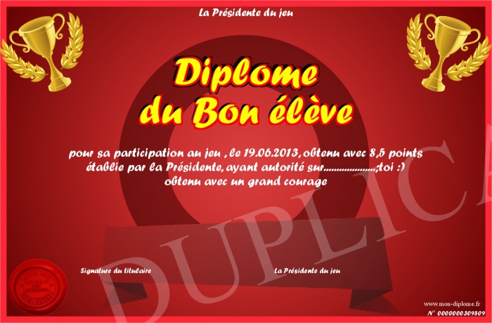 Envoyez par email votre Diplôme du Bon élève personalisé