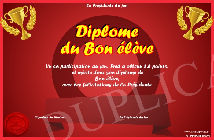 Envoyez par email votre Diplôme du Bon élève personalisé
