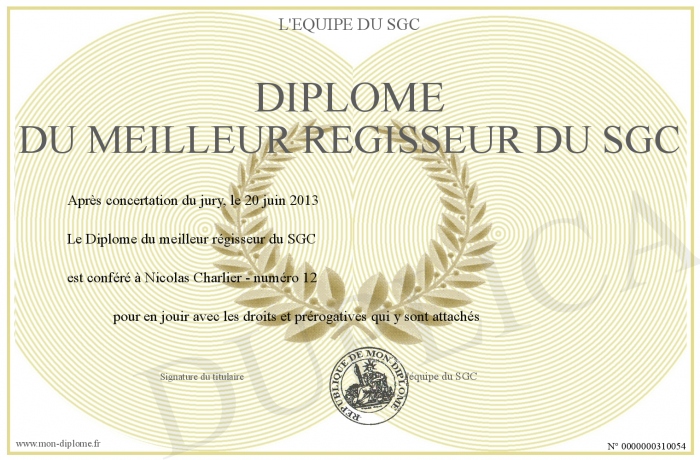 Envoyez par email votre Diplôme du meilleur régisseur du SGC personalisé