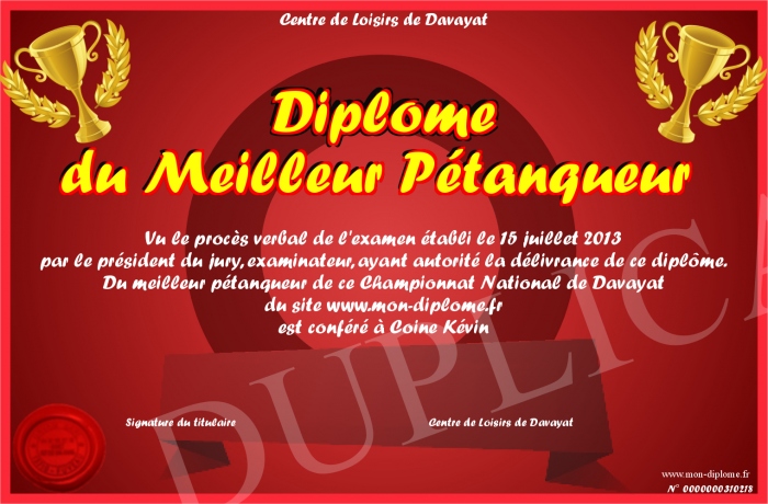 Envoyez par email votre Diplôme du Meilleur Pétanqueur personalisé