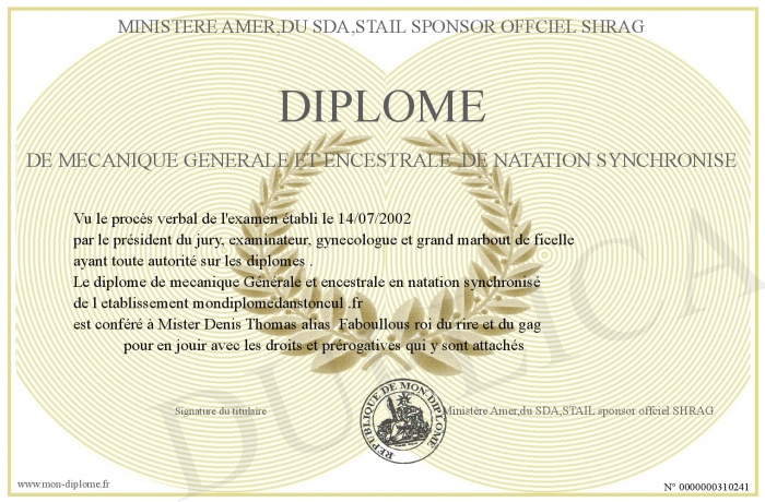 Envoyez par email votre Diplôme de mecanique Générale et encestrale ,de natation synchronisé personalisé