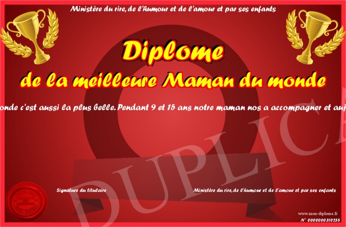 Envoyez par email votre Diplome de la meilleure Maman du monde personalisé