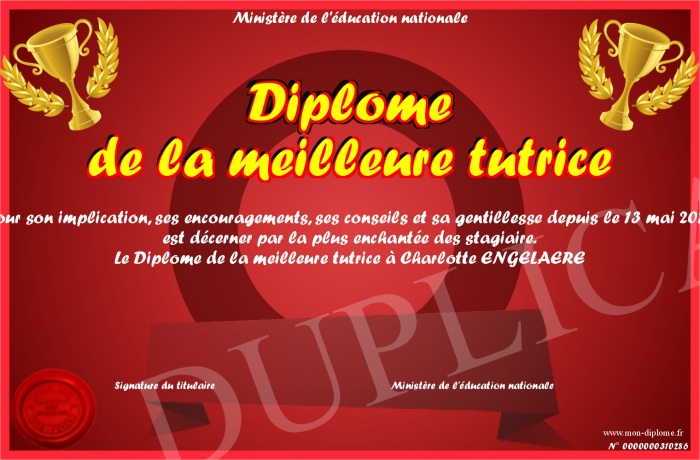 Envoyez par email votre Diplôme de la meilleure tutrice personalisé