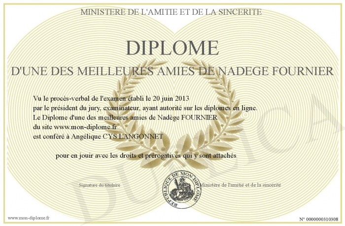 Envoyez par email votre Diplôme d'une des meilleures amies de Nadège FOURNIER personalisé