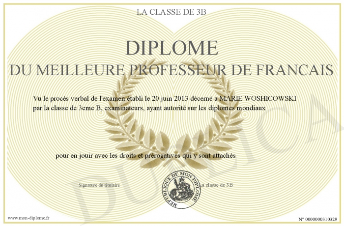 Envoyez par email votre Diplôme du meilleure professeur de francais personalisé