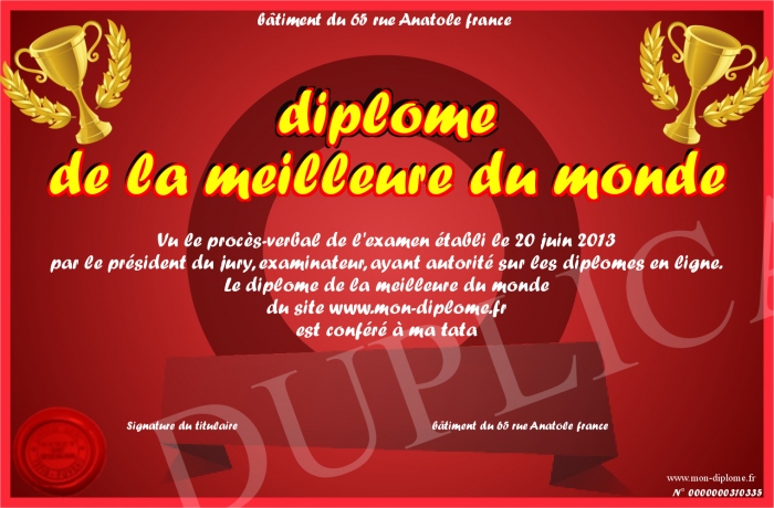 Envoyez par email votre diplôme de la meilleure du monde personalisé