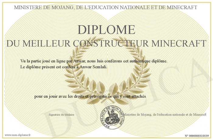 Envoyez par email votre Diplôme du meilleur constructeur Minecraft personalisé