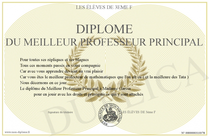 Envoyez par email votre Diplôme du meilleur professeur principal personalisé