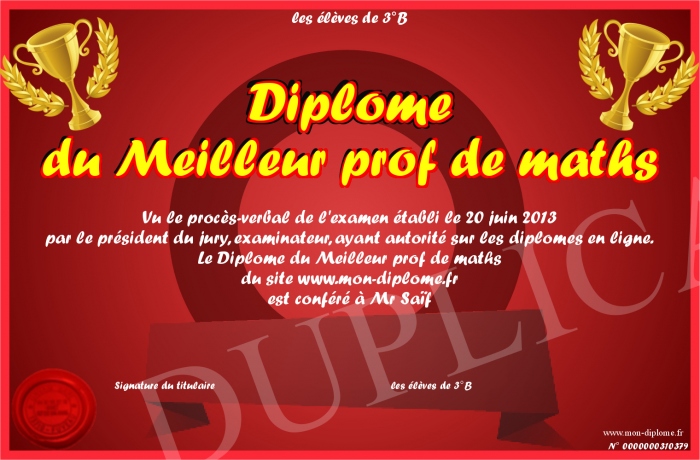 Envoyez par email votre Diplôme du Meilleur prof de maths personalisé