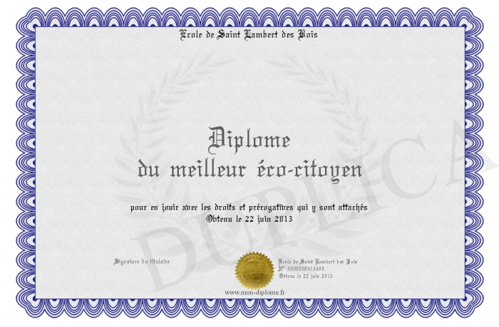 Envoyez par email votre Diplôme du meilleur éco-citoyen personalisé