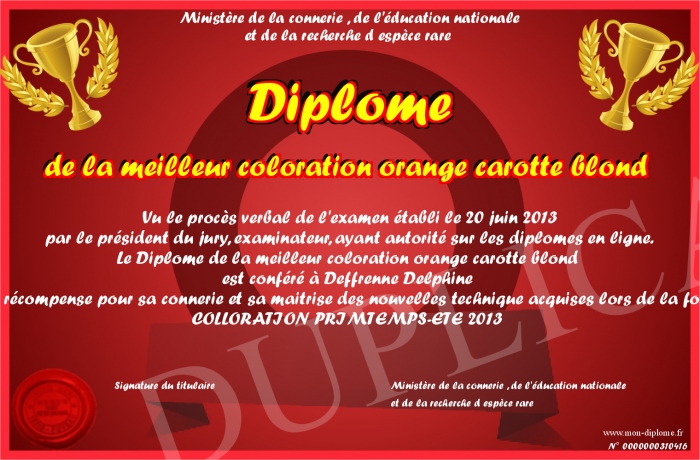 Envoyez par email votre Diplôme de la meilleur coloration orange carotte blond personalisé