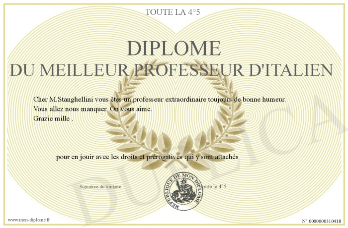 Envoyez par email votre Diplôme du meilleur professeur d'italien personalisé