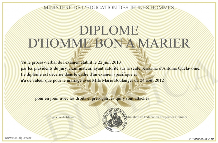 Envoyez par email votre Diplôme d'homme bon A marier personalisé