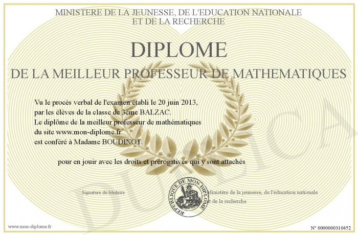 Envoyez par email votre Diplôme de la meilleur professeur de mathématiques personalisé