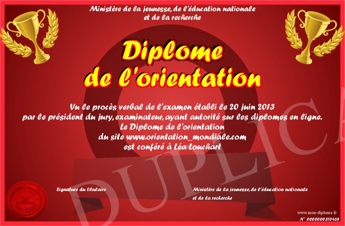 Envoyez par email votre Diplôme de l'orientation personalisé