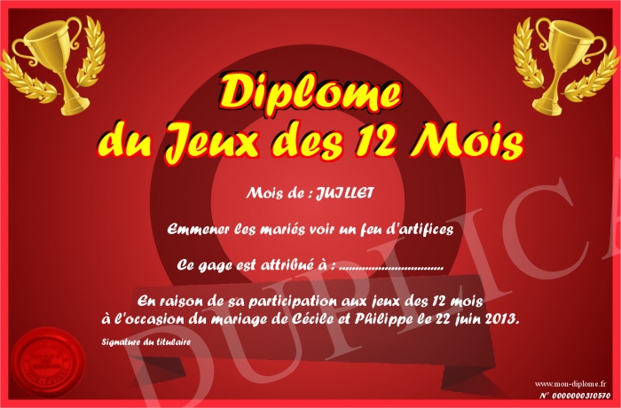 Envoyez par email votre Diplôme du Jeux des 12 Mois personalisé