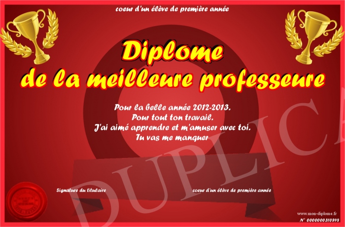 Envoyez par email votre Diplôme de la meilleure professeure personalisé