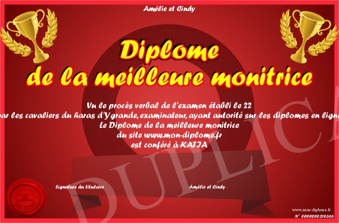 Envoyez par email votre Diplôme de la meilleure monitrice personalisé