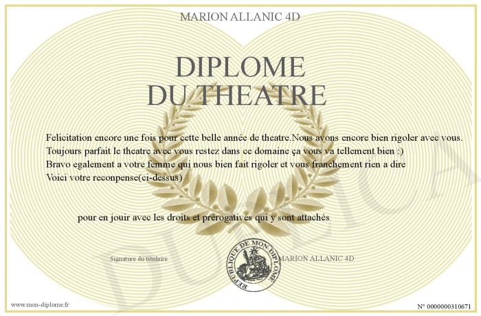 Envoyez par email votre Diplome dU THEATRE personalisé