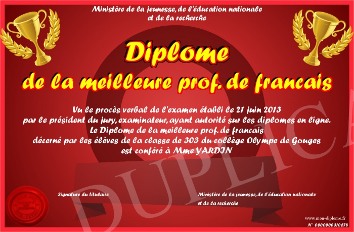 Envoyez par email votre Diplôme de la meilleure prof. de francais personalisé