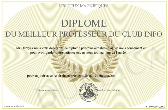 Envoyez par email votre Diplôme du meilleur professeur du club info personalisé