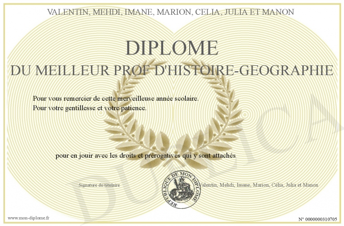 Envoyez par email votre Diplôme du meilleur prof d'histoire-géographie personalisé