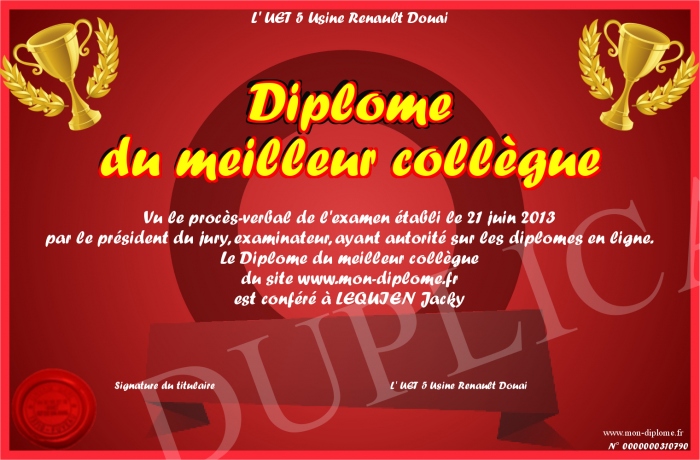 Envoyez par email votre Diplome du meilleur collègue personalisé
