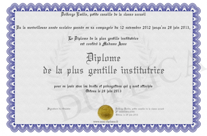 Envoyez par email votre Diplôme de la plus gentille institutrice personalisé