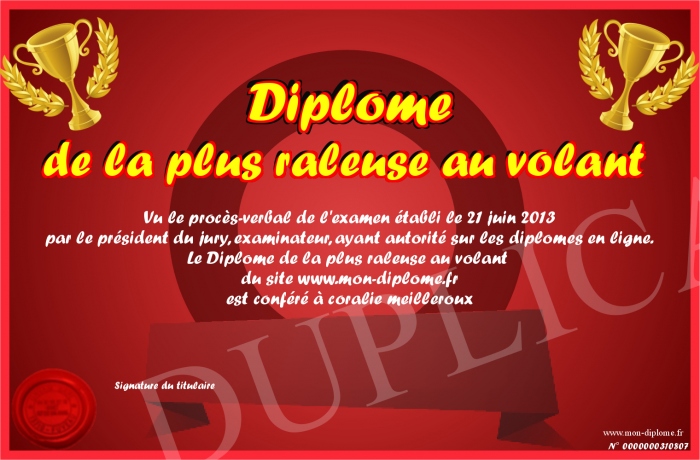 Envoyez par email votre Diplôme de la plus raleuse au volant personalisé