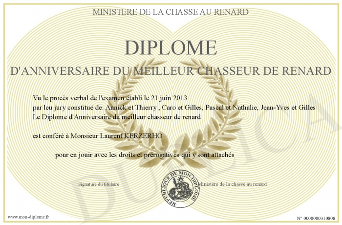 Envoyez par email votre Diplôme d'Anniversaire du meilleur chasseur de renard personalisé