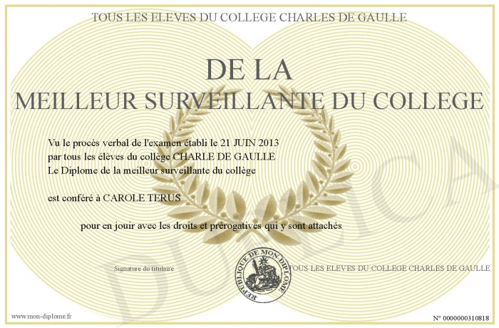 Envoyez par email votre DE LA MEILLEUR SURVEILLANTE DU COLLEGE personalisé