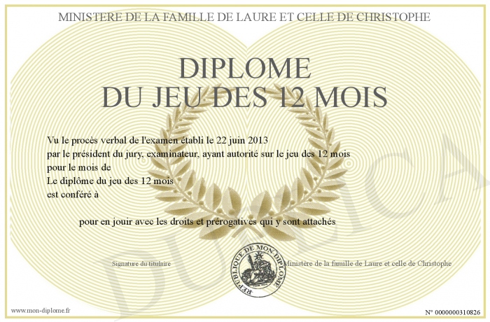 Envoyez par email votre Diplôme du jeu des 12 mois personalisé